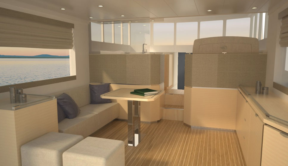 Gli interni hanno due diverse possibilità di layout, a seconda di dove l’armatore voglia posizionare la cucina, e sono personalizzabili sia nel mobilio che nei tessuti.