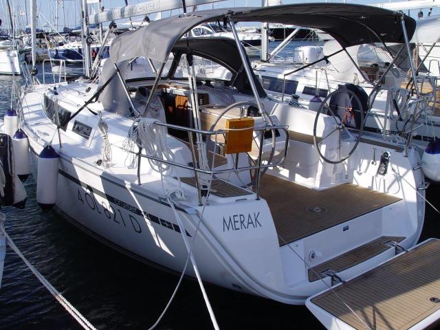 Il nostro Bavaria Cruiser 34 Merak è un?imbarcazione monoscafo a vela con motore ausiliario, la sua lunghezza è mt. 10,00. E? comoda per 6 persone, alloggiate in 3 cabine, 2 a poppa ed una a prua, ma può portare fino a 8 persone - ci sono infatti 2 posti aggiuntivi ricavabili in dinette, abbassando il tavolo; la barca ha 1 bagno con doccia interna ed 1 doccia esterna, anche questa con acqua calda; è l?ideale per una vacanza all?insegna del divertimento e del relax con la propria famiglia o con gli amici. E? provvista di una cucina completamente attrezzata con stoviglie per 8 persone , acqua calda, corrente elettrica 12V (220V disponibile quando collegati in porto con cavo), cappottina paraspruzzi e tendalino parasole rigido a protezione del pozzetto, tender.