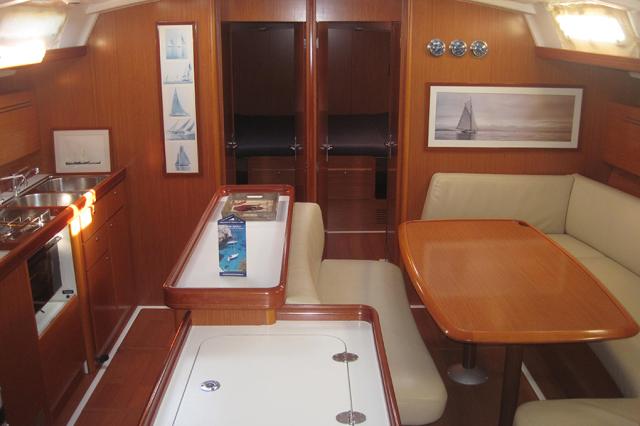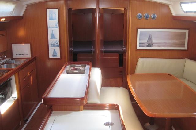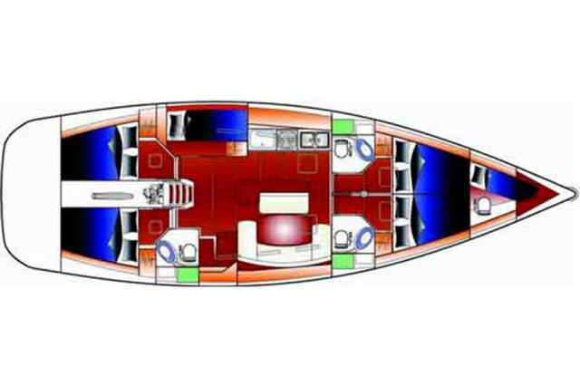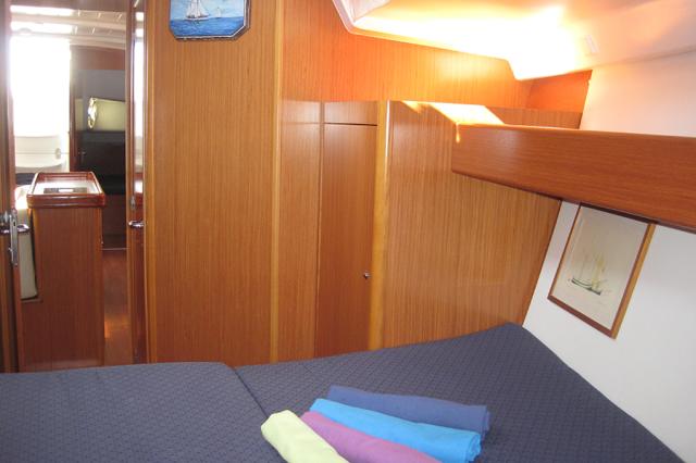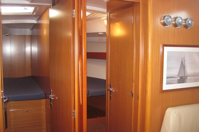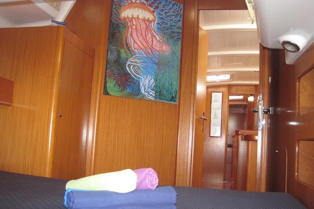 6 cabine: 4 cabine matrimoniali, 1 cabina singola, 1 cabina dello skipper, 3 bagni ospiti, 1 bagno skipper.