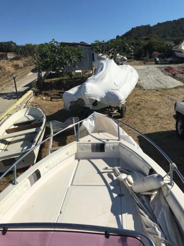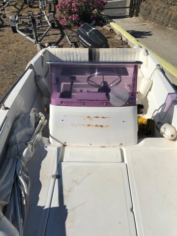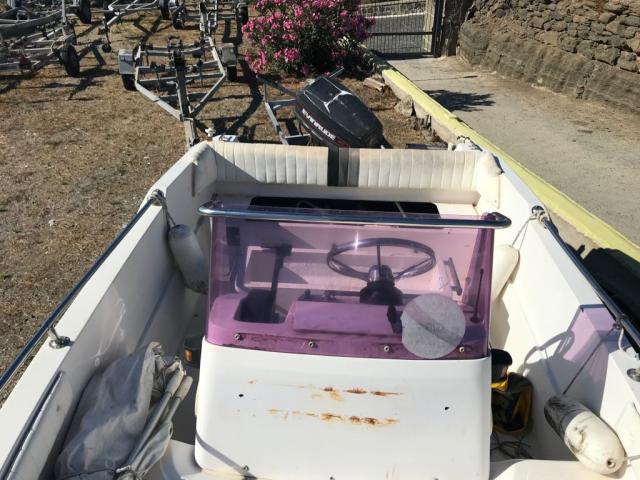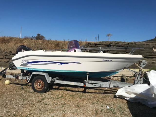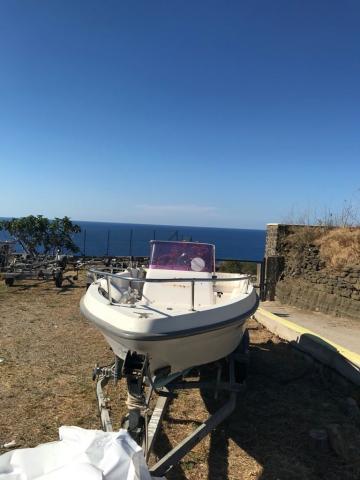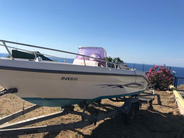 Imbarcazione Ranieri Azzurra m. 5.40 ft con scaletta di risalita, munita di luci di via, frontalino abbattibile, radio, doccetta, serbatoio acqua 20 l, attrezzatura di bordo, cuscineria recentemente rifatta con rivestimento in spugna asportabile, tendalino, 1 ancora, autoradio e paracolpi.