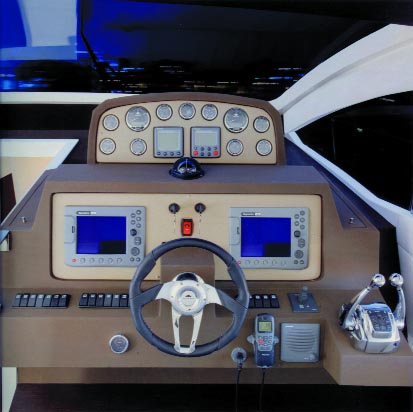 Una comoda scala in vtr e teak rende la salita e discesa dal fly quanto mai sicura ed agevole; l’ampio pozzetto è attrezzato con un comodo divano, mentre attraverso due ingressi laterali si accede alla plancia di poppa, ampia e comoda.