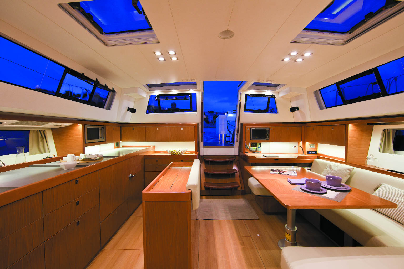 Tutte le cabine, sia l’armatoriale che le VIP, sono dotate di bagno con doccia separata e sono poste tutte verso prua per essere lontane dai rumori della banchina e del pozzetto, al di sotto del quale sono raggruppate tutte le attrezzature, gli impianti e gli equipaggiamenti, e per garantire la giusta privacy a tutti gli ospiti a bordo. Il punto di scotta randa è fissato su un rollbar fisso, in modo da lasciare libera la discesa; inoltre Sense 50 dispone in opzione di una porta d’entrata motorizzata, di tavoli e oscuranti elettrici, di una TV LCD led 32′ a scomparsa, di una stazione di ricarica e di numerosi altri equipaggiamenti. La gamma Sense è stata concepita per adattarsi alle tecnologie più innovative: propone infatti la propulsione ibrida ed è in grado di offrire all’armatore e ai suoi ospiti il massimo piacere e il massimo confort in navigazione. Il design della carena offre una performance massimale verso i 15° di sbandamento invece dei 20° abituali, garantendo così spostamenti in navigazione più semplici e sicuri. Gli interni sono al contempo estremamente eleganti e funzionali: Sense 50 presenta pagliolato stratificato ” quercia chiara “, tessuti homestyle, piani di lavoro in resina di sintesi che integrano i lavelli; a completare l’offerta, numerosi equipaggiamenti high tech che consentono anche di installare funzioni “nascoste”, per nascondere fornelli, TV e sedute quando non vengono utilizzati. La gamma Sense è disponibile in 2 tipi di allestimenti, che già nel nome richiamano suggestioni e immagini di bellezza e comfort: inspiration e sensation, entrambe dal comportamento marino eccezionale e dalla qualità innegabile.