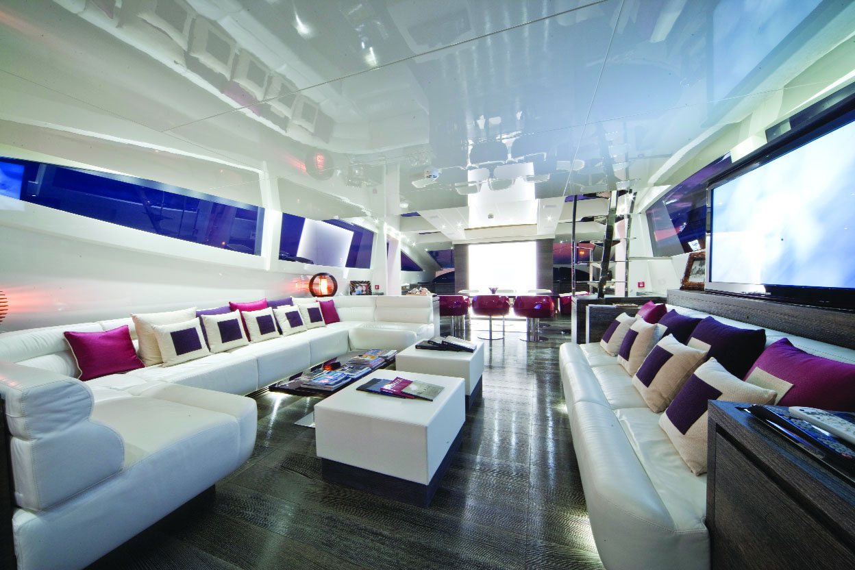 Dal pozzetto di poppa si trova, sulla sinistra, un bagno giorno e sulla destra la discesa alla zona servizi (cucina + alloggio comandante) con una scala a chiocciola. Più avanti c’è un ampio salone con un grande divano a C e tavolo centrale sulla sinistra e sul lato opposto uno spazio che offre la possibilità di avere diversi layout.