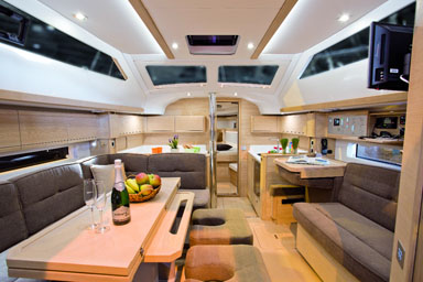 Per gli interni è stato scelto il rovere sbiancato e la configurazione risulta invertita rispetto ai soliti cruiser a vela: tanta luce naturale e ottima vivibilità caratterizzano il deck saloon con un’altezza di oltre 2 metri. La dinette è attraversata da una finestratura a 180° e da oblò fissi ad entrambi i lati in una perfetta fusione tra spazi interni ed esterni: un tavolo fisso con ali pieghevoli, armadietti e mensole dietro alle sedute assicurano grande vivibilità.