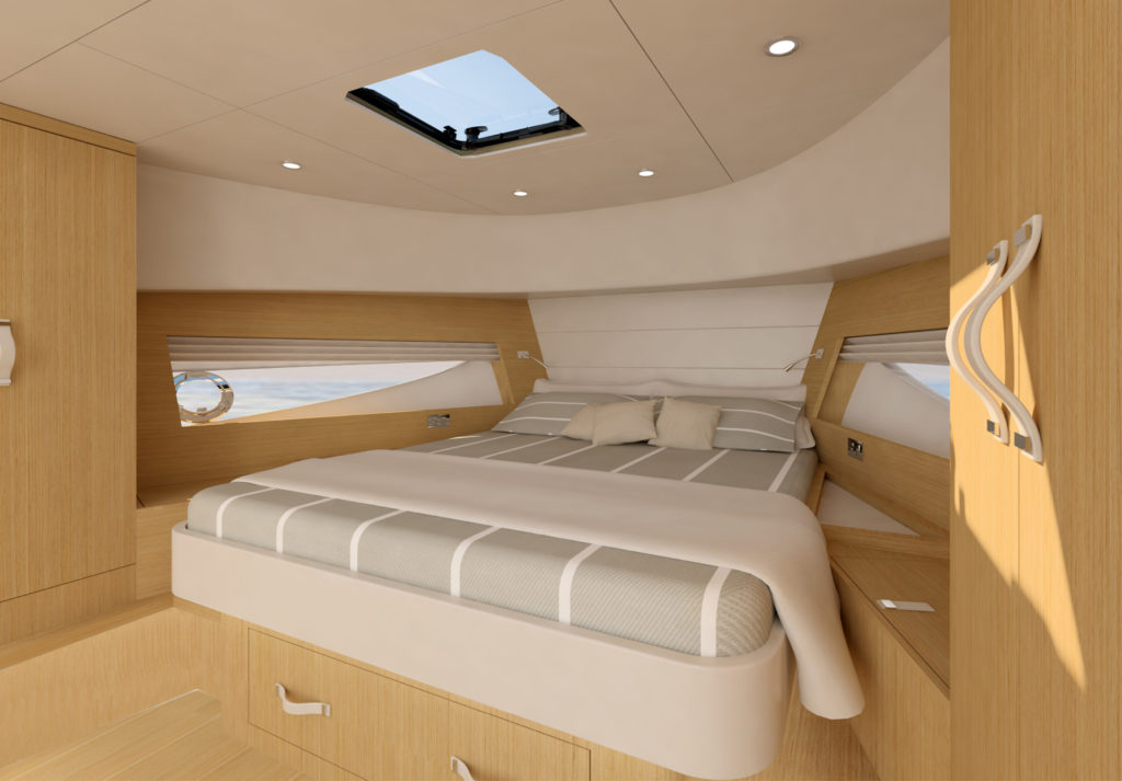 Il layout degli interni prevede due soluzioni, entrambe con la cabina armatoriale a tutto baglio posta a prua. Nella prima versione è presente una seconda cabina a due letti gemelli, con finestra e accesso al locale bagno, mentre nel secondo layout lo spazio dedicato agli ospiti è occupato da un comodo salottino con divani e tavolino centrale.