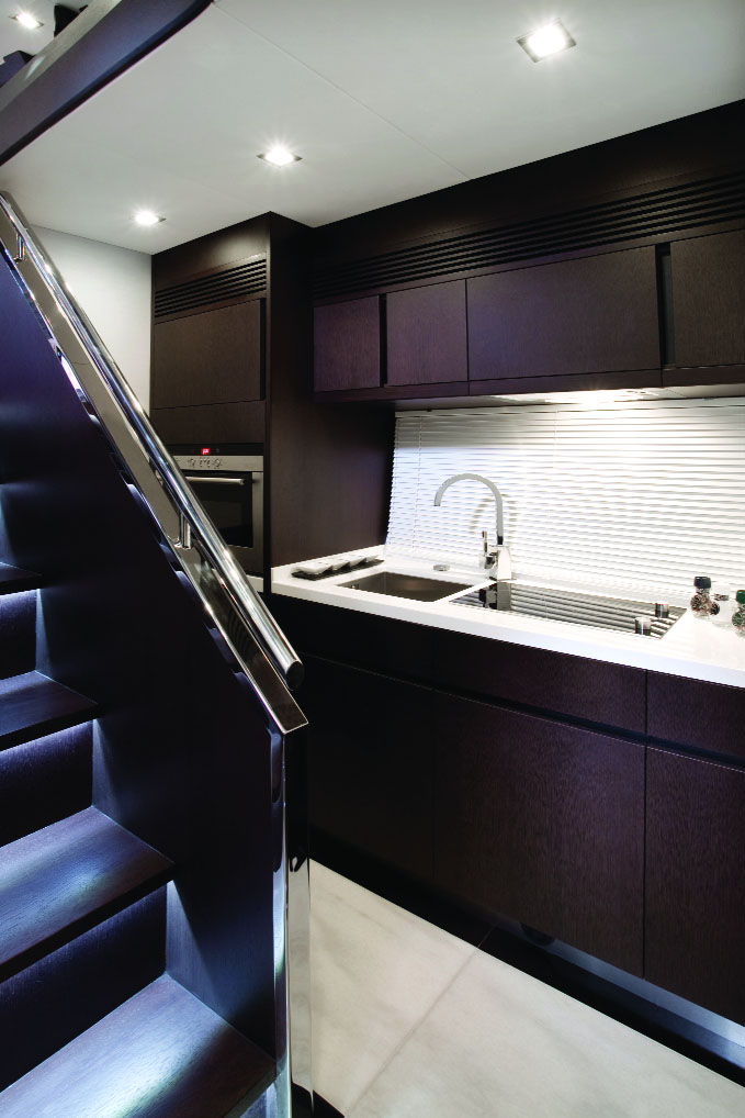 La versione da 70 piedi, disegnata da Tony Castro, offre una grande vivibilità, con ambienti arricchiti dalle finestrature del salone, che garantiscono una grande illuminazione naturale e la possibilità di allargare ulteriormente gli spazi.