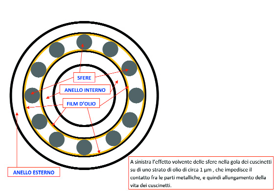 Nei cuscinetti, le sfere non sono mai a contatto diretto con le altre parti volventi, un film di olio, che va da circa 0,7 µm a 7 µm li divide, distanza che può variare per due fattori importanti, il primo è in fase di progettazione della macchina, in cui sono allocati i cuscinetti, i quali, devono essere scelti in base ai carichi che devono sopportare, il secondo fattore, non meno importante, è la viscosità dell’olio, la giusta viscosità, la suggerisce il costruttore della macchina e dipende da tanti fattori (velocità, temperature, ecc.).