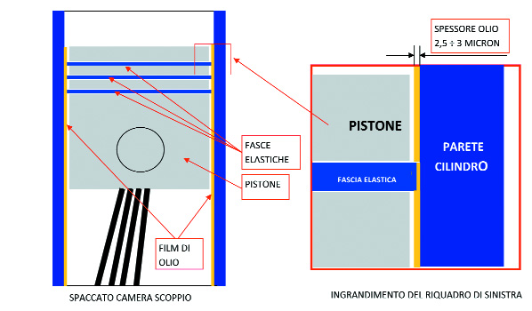 Il motore, durante il suo funzionamento ha estrema necessità della lubrificazione, bastano pochi secondi senza olio che si bloccherebbe tutto, dai cuscinetti di biella all’albero motore a tutti gli altri ruotismi, ma la parte più critica è il pistone, con il suo movimento nel cilindro, in presenza di temperature elevate, con la velocità che può arrivare a 30 mt/sec, senza toccare mai il cilindro direttamente, se non tramite degli anelli di tenuta che, anche loro non lo toccano, se non tramite un sottilissimo film di olio di circa 3 micron che ne assicura la distanza e la tenuta. ma funzionando, nel tempo, gli additivi che danno la viscosità all’olio, si consumano e di conseguenza la viscosità dell’olio, scende a valori che possono creare danni irreparabili, le fasce elastiche non più mantenute a distanza, si avvicinano pericolosamente al cilindro, particelle inquinanti, inglomerate nell’olio di dimensioni inferiore a 2,5 micron cominciano a comportarsi come abrasivi, creando altre particelle, con attriti, perdite di potenza e perdite di tenuta, fino all’atto finale, ilcontatto diretto dei metalli, ed è, il grippaggio.