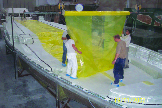 Questa tecnica fondamentalmente differisce dalle tecnologie tradizionali in quanto la resina non va “rullata” a mano o “spruzzata” dagli operatori (confronta articolo Gennaio 2010 Mondo Barca Market). Al contrario, invece, grazie ad un impianto opportunamente realizzato in cantiere (pompe per il vuoto, trappole per catturare la resina in eccesso, macchinari per la catalisi ed il relativo dosaggio), l’impregnazione ha luogo sotto l’effetto di una depressione che si viene a creare (grazie all’apposita pompa che è il cuore dell’impianto) all’interno dei tessuti di fibra in maniera semi-automatica.