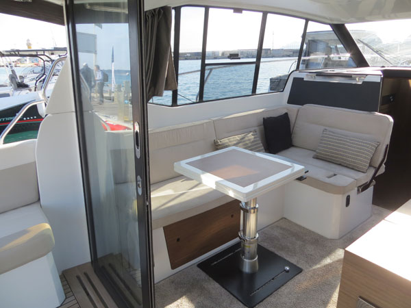 Non perdiamo altro tempo, saliamo a bordo passando dalla grande plancetta e siamo accolti da un divanetto a forma di L con schienale su tutta la sua lunghezza. Sia la plancetta che il pozzetto sono rivestite in teak. Già in quest’area possiamo intuire l’aspetto “trasformista” della barca: la seduta del divano di poppa può essere spostata in avanti e lo schienale può essere abbattuto a scelta a seconda della situazione. Con schienale in posizione alzata si guadagnano circa 20 centimetri di spazio in plancetta, mentre con schienale abbattuto diventa un comodo prendisole.