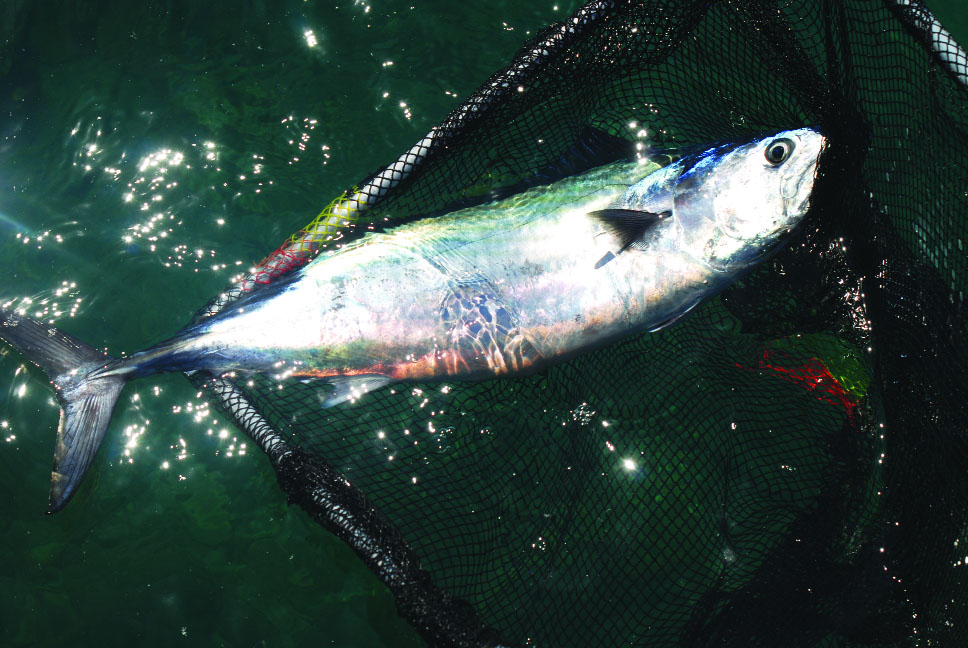 Se si può, è bene alternare il flusso di pastura con pezzetti di sarda gettati a mano e con il pasturatore tritasardine elettromeccanico. Per ogni pescata di circa 4 – 6 ore ci vuole almeno una cassa di sardine, altrimenti potremmo economizzare con mezza cassa se i pesci sono ben attivi sotto bordo. Nel senso che i pesci se sono presenti, vanno stimolati e non saziati. Caliamo le canne: la prima, con galleggiante a 15 metri circa dall’esca, fuori per 20-30 metri, a zavorra zero; la seconda, libera senza galleggiante a zavorra zero; le altre due, una con 1-2 grammi di piombo, e l’altra, con 5-6 grammi di piombo, per verificare in quale interstrato d’acqua si prendono più pesci. Ad ogni canna calata in acqua è necessario aprire l’archetto del mulinello e lasciarlo libero, facendo fuoriuscire lentamente la lenza in corrente.