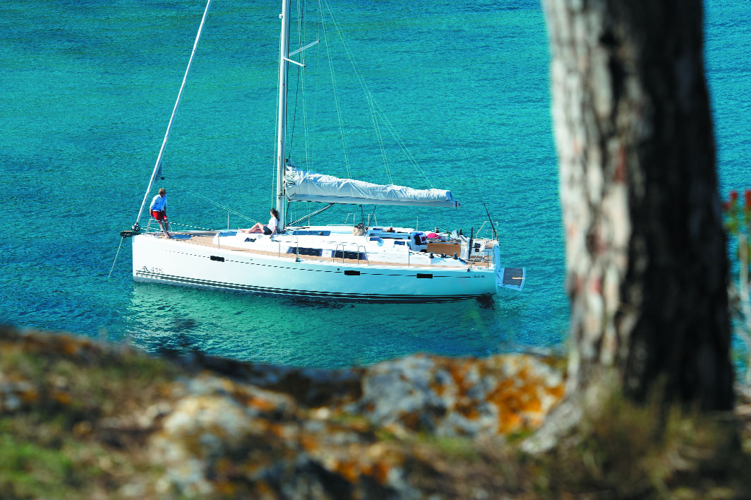 Aprendo la porta per entrare in cabina si resta subito colpiti dall’elegante design del mobile cucina e dei raffinati legni impiegati. Tutti i vani sono chiusi e la dotazione è completata dalla piastra in vetroceramica, forno a microonde e il frigo. Sul lato di dritta c’è la porta per accedere al bagno anche questo disegnato in modo raffinato con il lavello rotondo che richiama quello della cucina. Ovviamente il WC è elettrico (con serbatoio acque nere) e c’è la possibilità di farsi la doccia. La parte prodiera ha la classica configurazione a V con il tavolo abbassabile che trasforma le sedute in una comoda cuccetta. Sul lato di dritta dopo il locale bagno c’è un ampio e comodo armadio.