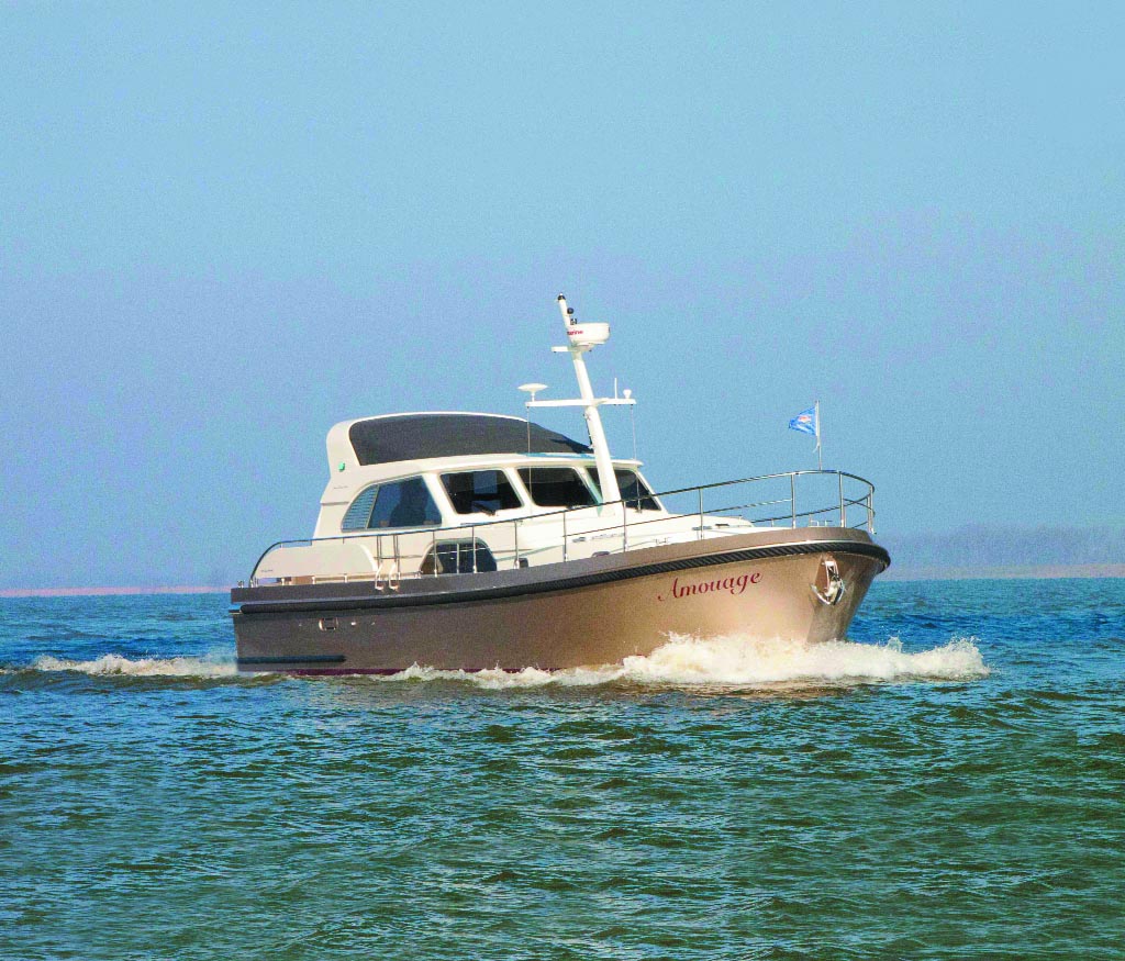 Tre gradini ci conducono alla zona sottocoperta dove troviamo un ampio tavolo con doppio divanetto, e, a destra, la cucina pratica e funzionale. Le ampie finestrature, presenti sia nella dinette che nel salone, garantiscono piena luminosità. La zona notte è composta da un grande bagno con box doccia ad accesso separato e dotabile di lavatrice, di fronte al quale è posta la cabina ospiti, con due letti singoli, mentre la cabina armatoriale con un grande letto matrimoniale (e accesso diretto al bagno) trova posto a prua. Anche qui, spazio e luce non mancano mai. Le opzioni a disposizione per quanto riguarda la propulsione sono due: un motore MO126K25-D a 6 cilindri e 120 hp di potenza, o due MO94K33 a 4 cilindri e 90 hp.
