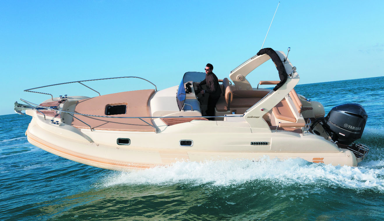 Questo modello, in soli sette metri e mezzo, ha caratteristiche estetiche e dinamiche tipiche sia del gommone che di una barca: infatti l’elemento pneumatico ne determina la stabilità; mentre le murate in vetroresina proteggono il pozzetto come su un motoscafo.