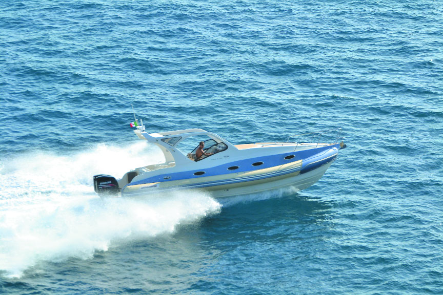 Un 34 piedi che si caratterizza per un’altezza di murata più da barca che da gommone, le fiancate sono in tonalità bicolore a scelta fra diverse colorazioni.