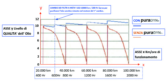 L’olio nel suo passaggio nella massa filtrante, è costretto a passare, attraverso un pacco stratificato di additivi a lento rilascio, (sono i componenti chimici che conferiscono la viscosità all’olio) in cui si ricaricano, quel tanto che basta a sostituire quelli consumati, a questo punto l’olio, pulito da tutte le impurità solide pericolose, privo di tutti i liquidi nocivi e ricaricato degli additivi per la giusta viscosità, torna per gravità nella coppa del motore. Questo stato di filtraggio continuo, fa in modo che l’olio nel motore arriva ad un livello di qualità superiore a quello dell’olio nuovo appena messo nei normali cambi (vedi diagramma 1).