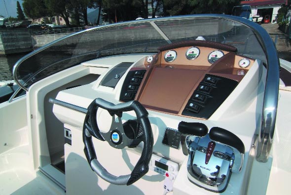 Il pozzetto è arredato con un divano a L che viene ingegnosamente interrotto dal comodo accesso all’acqua, caratteristica importante per un’imbarcazione con motorizzazione fuoribordo. Inoltre, il lungo tavolo associato al divano può essere abbattuto per creare una zona prendisole.