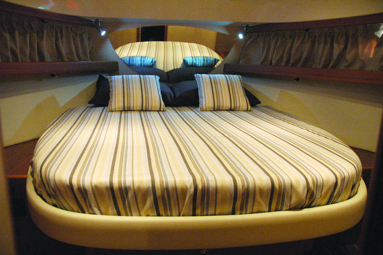 La zona notte è suddivisa nella cabina ospiti, a destra, con due comodi letti sovrapposti e un armadio, un bagno con doccia e frontalmente la cabina armatoriale con un grande letto centrale e interessanti e funzionali arredi.
