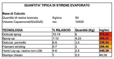 A questo punto, sulla base delle percentuali tipiche di stirene evaporato in funzione della tecnologia di stampaggio, è possibile calcolare le quantità tipiche di solvente immesse nell’ambiente di lavoro.