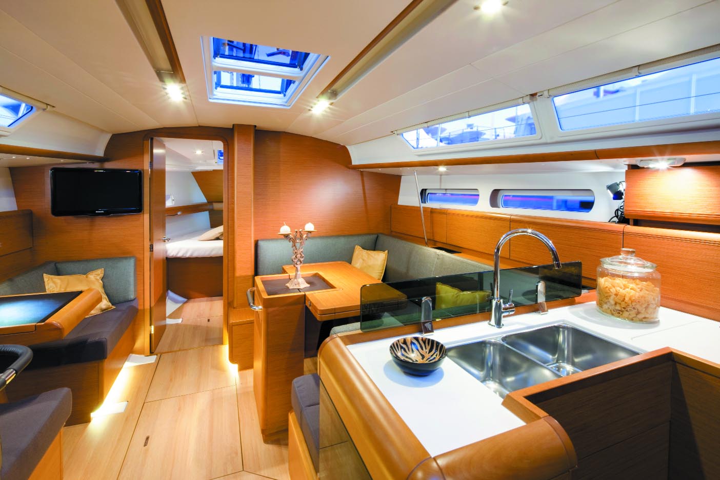 Un piano di lavoro, ricoperto da un’elegante lastra di vetro, fa da separazione ideale tra l’area cucina, attrezzata con un frigo dalle dimensioni davvero ragguardevoli e con un numero infinito di gavoni, e il divano nel quadrato ma quello che davvero attira l’attenzione è il solido tavolo centrale della dinette, che con un semipiano aperto crea un piano d’appoggio quadrato di buone dimensioni, mentre chiuso occupa il minimo spazio ribaltandosi sulla parete fissa; abbassando inoltre il piano al livello della seduta, si ottiene in pochi minuti un ulteriore posto letto matrimoniale. I layout disponibili sono a 2 o 3 cabine, con 1 o 2 bagni. Tutti i punti luce sono dotati di lampade a LED, che abbassano i consumi e durano a lungo, incidendo sensibilmente sulla gestione dei costi. Le prestazioni in navigazione sono davvero eccellenti, il timone è decisamente reattivo e preciso.