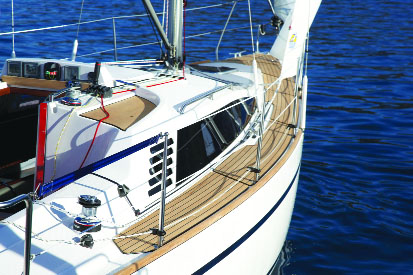 L’asse del timone è in acciaio inox e vi è integrato il blocco dell’asse sotto la barra, mentre i passavanti sono larghi e ampiamente praticabili; inoltre il passaggio da prua a poppa è reso ancora più agevole grazie alla ripartizione del sartiame (sartia alta a murata, sartia bassa a tuga). Anche il pozzetto dell’ancora è molto ampio, proprio per consentire uno stivaggio ottimale della catena dell’ancora permettendone sempre l’abbisciamento.