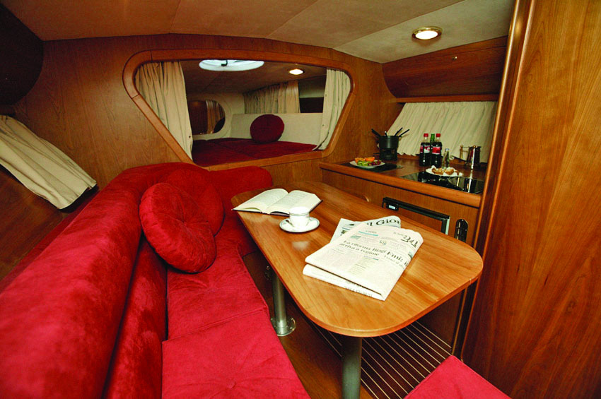 Caratterizzata da linee di alto impatto visivo e dal comfort dato dalla cura dei dettagli, come: la cucina dotata di piano cottura, lavello in acciaio inox e frigorifero; la dinette con un divano “C” ed un tavolo con la base regolabile; il locale bagno con il lavabo inserito nel mobile, lo specchio, la doccia e l’indicatore di livello delle acque nere; la cuccetta amatoriale e quella degli ospiti finemente arredate. Esternamente fanno bella mostra di sé il ponte ed il pozzetto che hanno il pavimento in teak, il divano ad “L”, il tavolo a scomparsa, il prendisole, la piattaforma bagno integrata in teak.