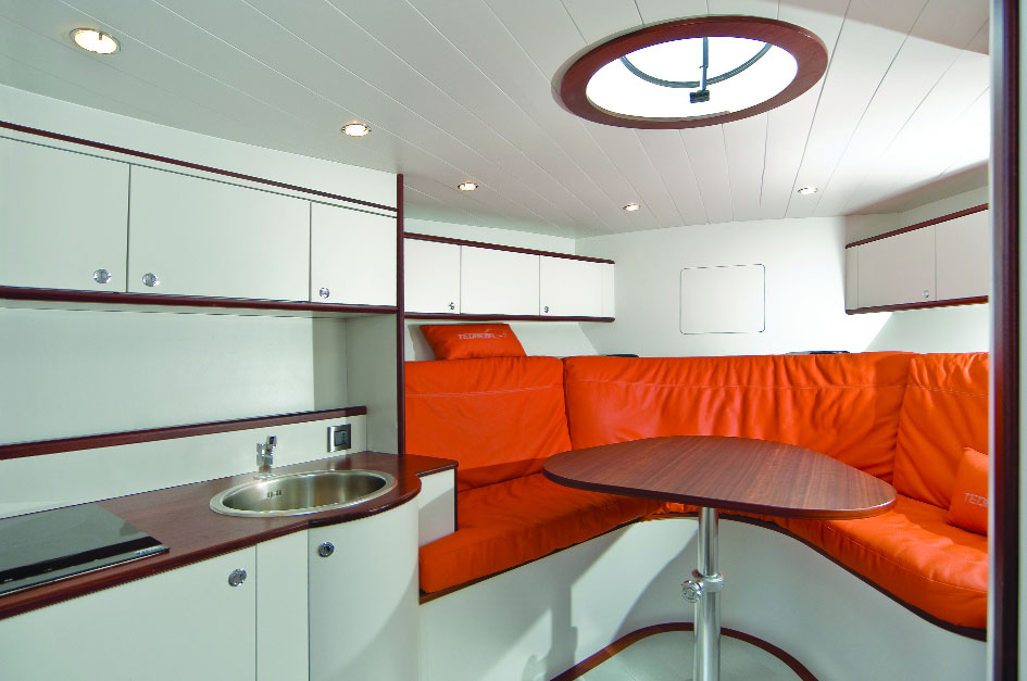 Il pozzetto è diviso in due livelli: in quello superiore trovano posto un ripiano ed un lavandino a scomparsa posizionati in due mobiletti laterali; mentre procedendo verso prua si attraversa una vasta zona relax.